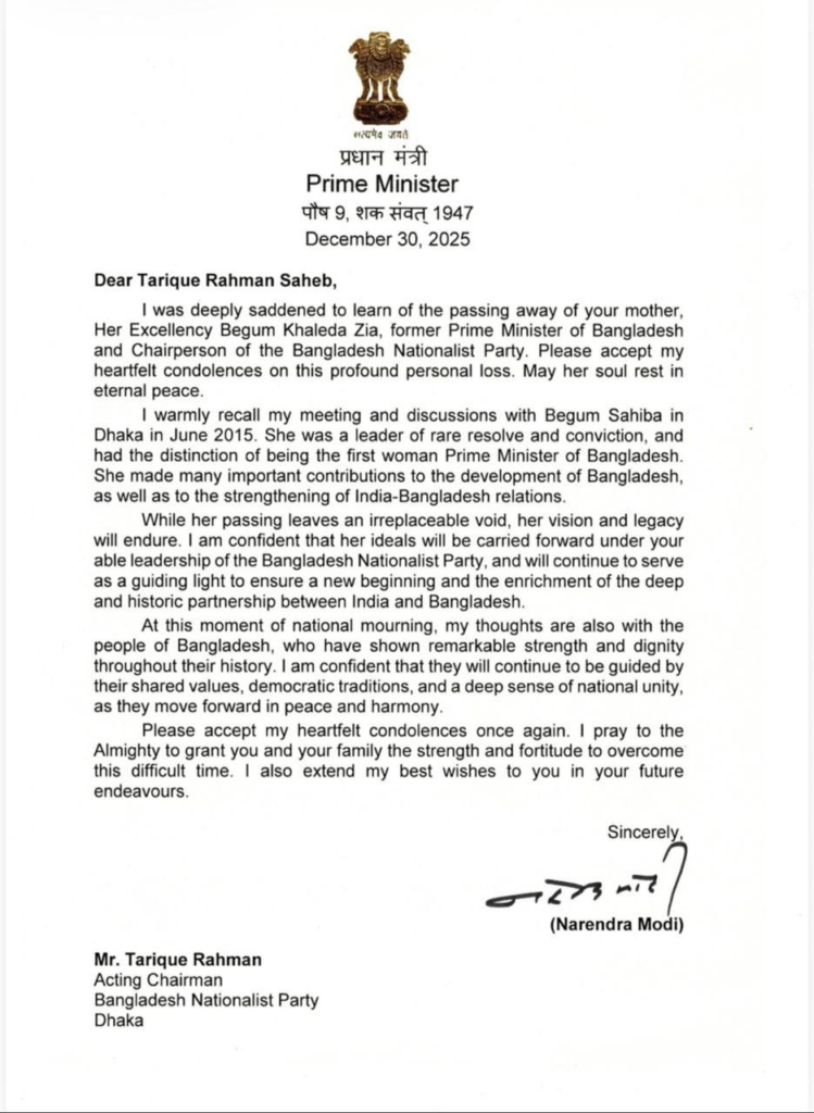 PM Narendra Modi’s letter to BNP chief Tarique Rahman