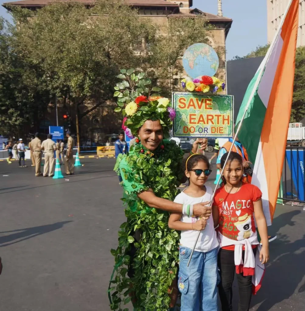 On that same track, you could see elite East African athletes chasing world records alongside massive corporate contingents marching in uniform. Most striking of all were the carnival-like walking performances—participants dressed in elaborate costumes or uniforms, clutching vibrant placards. These signs ranged from grand national visions like “Make in India” and “Startup India” to fundamental social pleas like “Save the Girl Child” and environmental calls to protect the planet.