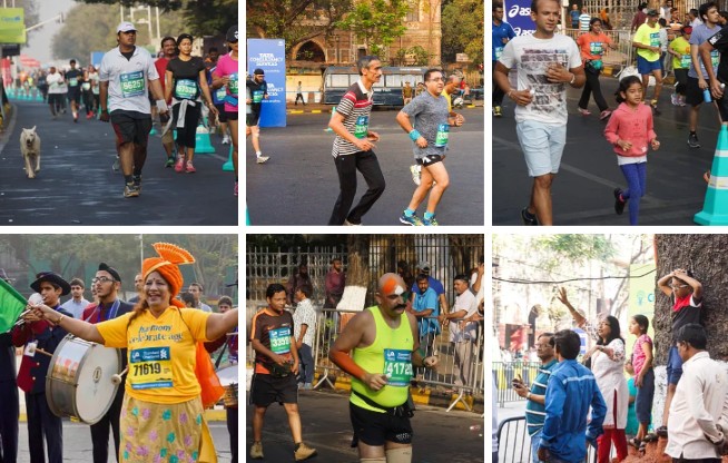 A comprehensive gallery of the 2016 Mumbai Marathon: featuring traditional drummers, a runner with Indian flag face paint, spectators cheering from trees, a stray dog running with athletes, a father and young daughter running together, and diverse citizens in motion.